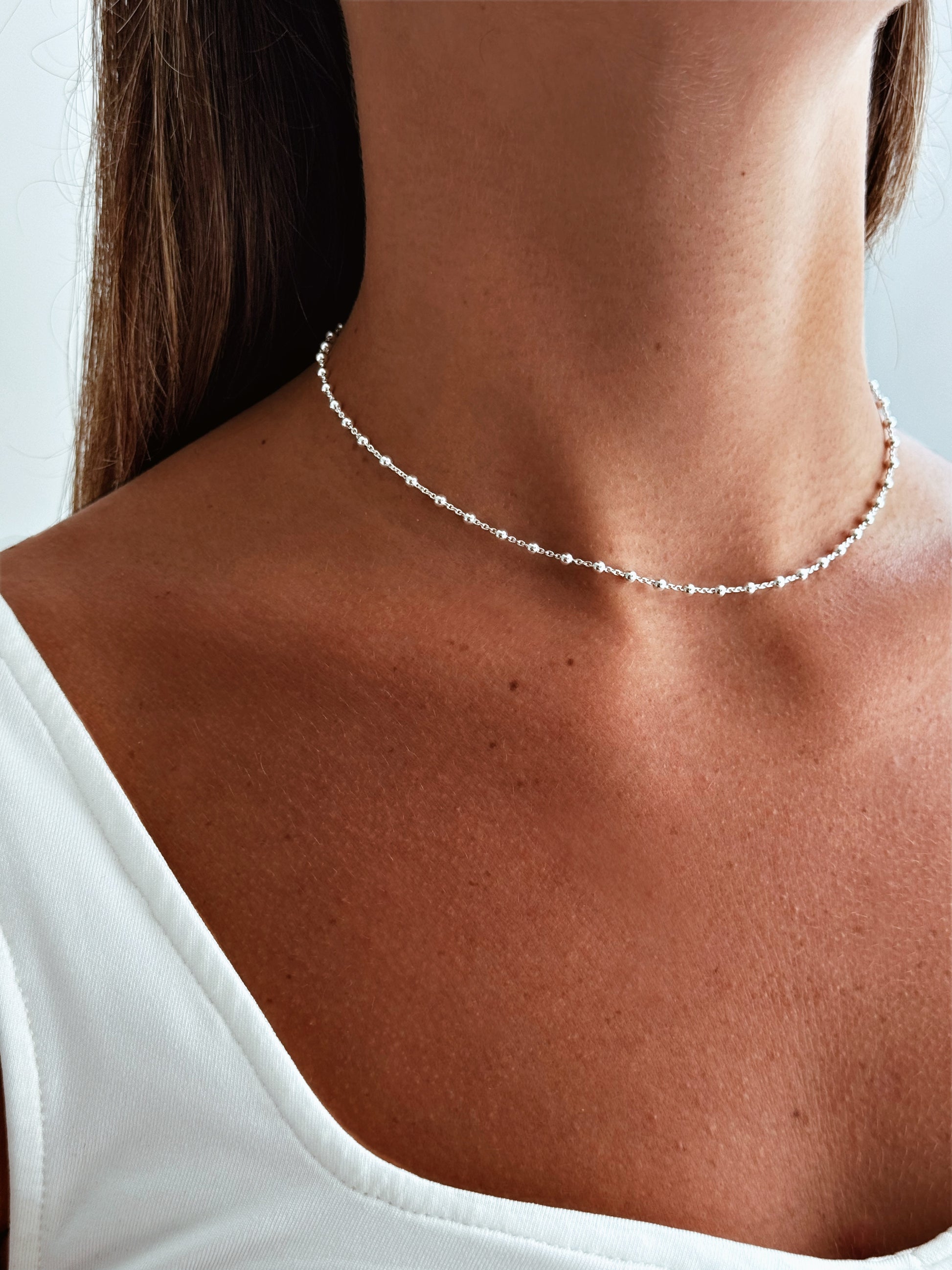 The LUANA choker features tiny silver beads along a fine chain, creating a clean, minimal look with a touch of texture. Perfect for layering or wearing solo for a soft shine.