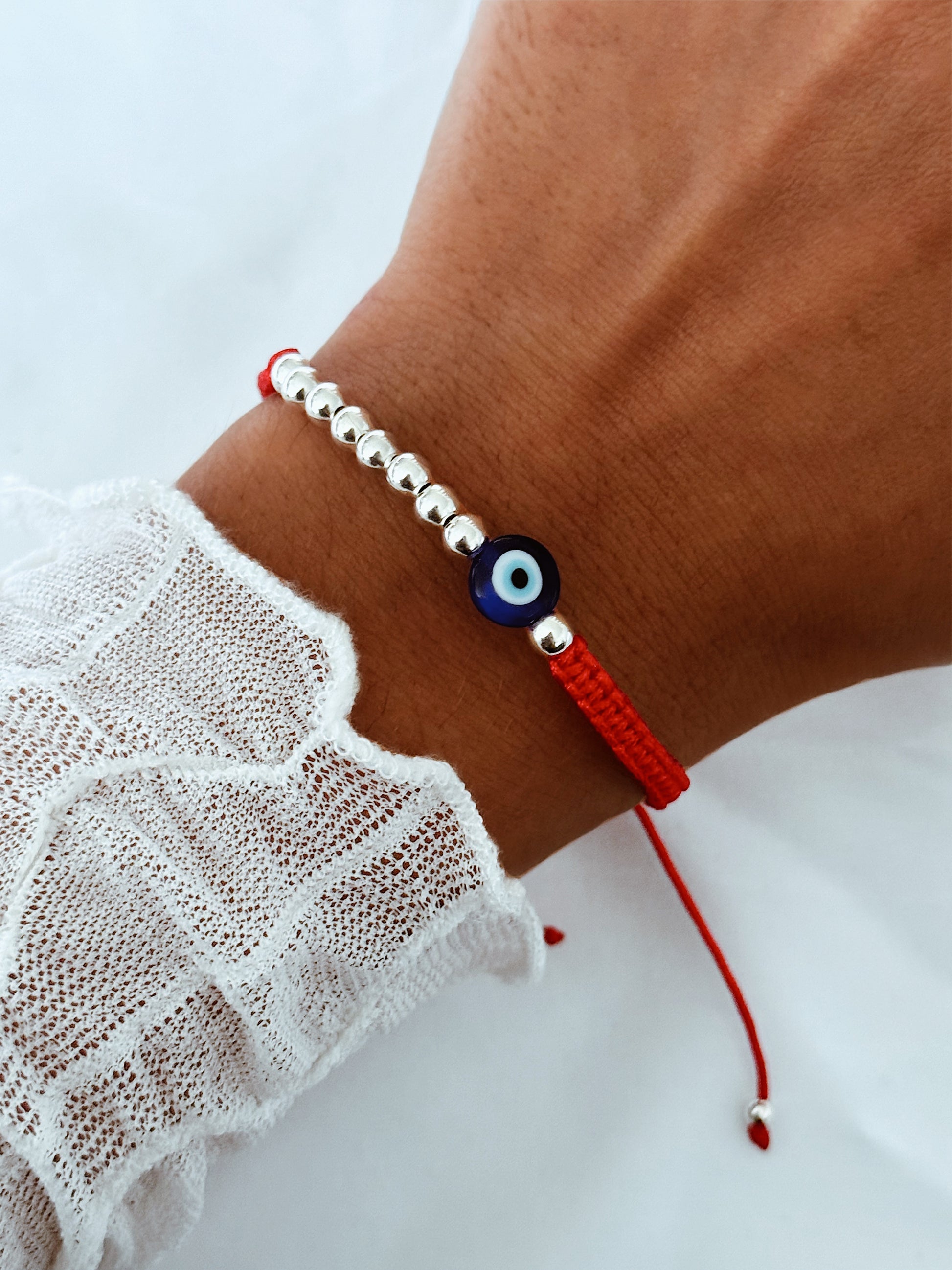 CATALINA blends vibrant red cord with delicate silver beads and a bold evil eye charm — designed to protect and stand out.