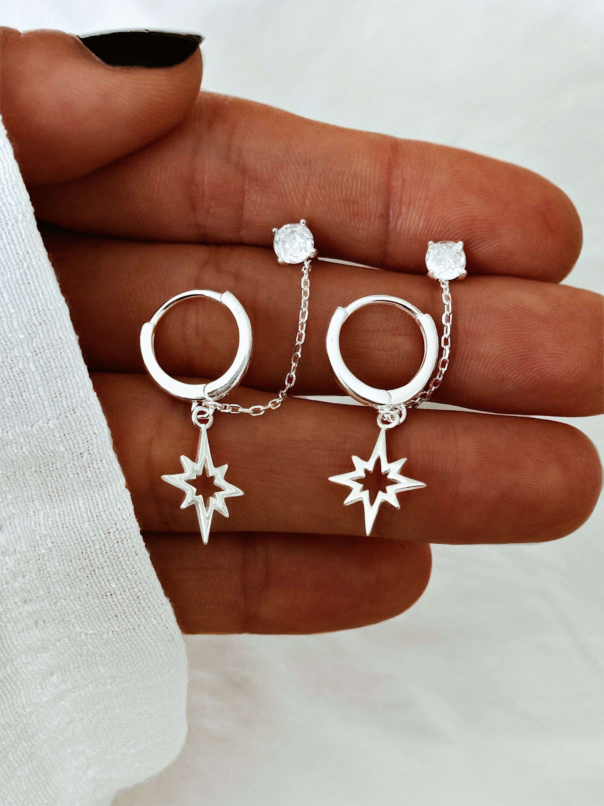 MILENA earrings blend hoops and studs with a delicate chain and a north star charm for a bold celestial look that catches every eye.