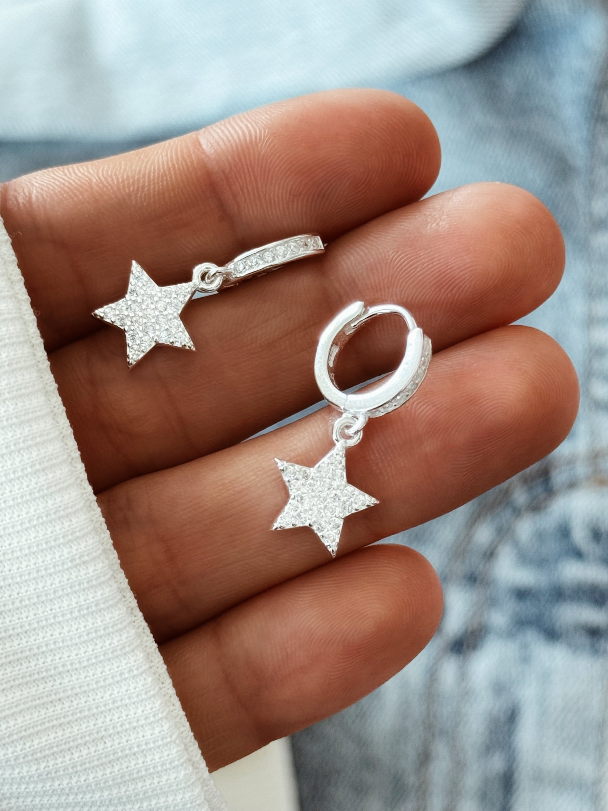The Miranda earrings feature dainty star-shaped charms encrusted with sparkling stones, dangling from polished mini hoops. A playful yet elegant piece that adds charm and glow to any outfit.